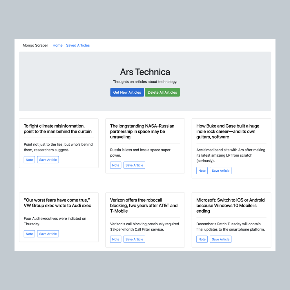 Mongo Scraper is a web application that utilizes Mongoose and Cheerio to scrape articles from Ars Technica, and allows users to save articles and to make notes.