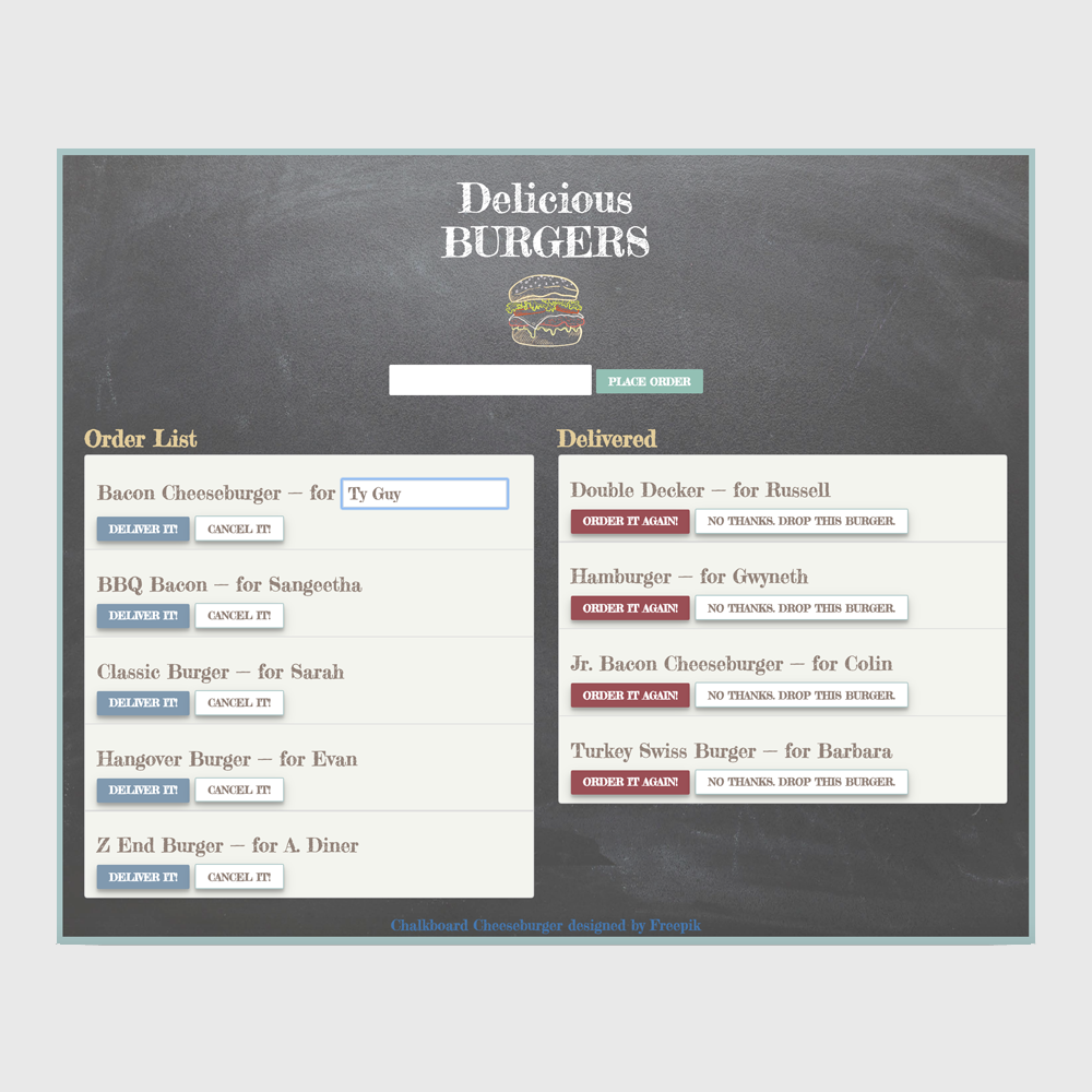 Delicious Burgers is an app that lets users input a burger to order.